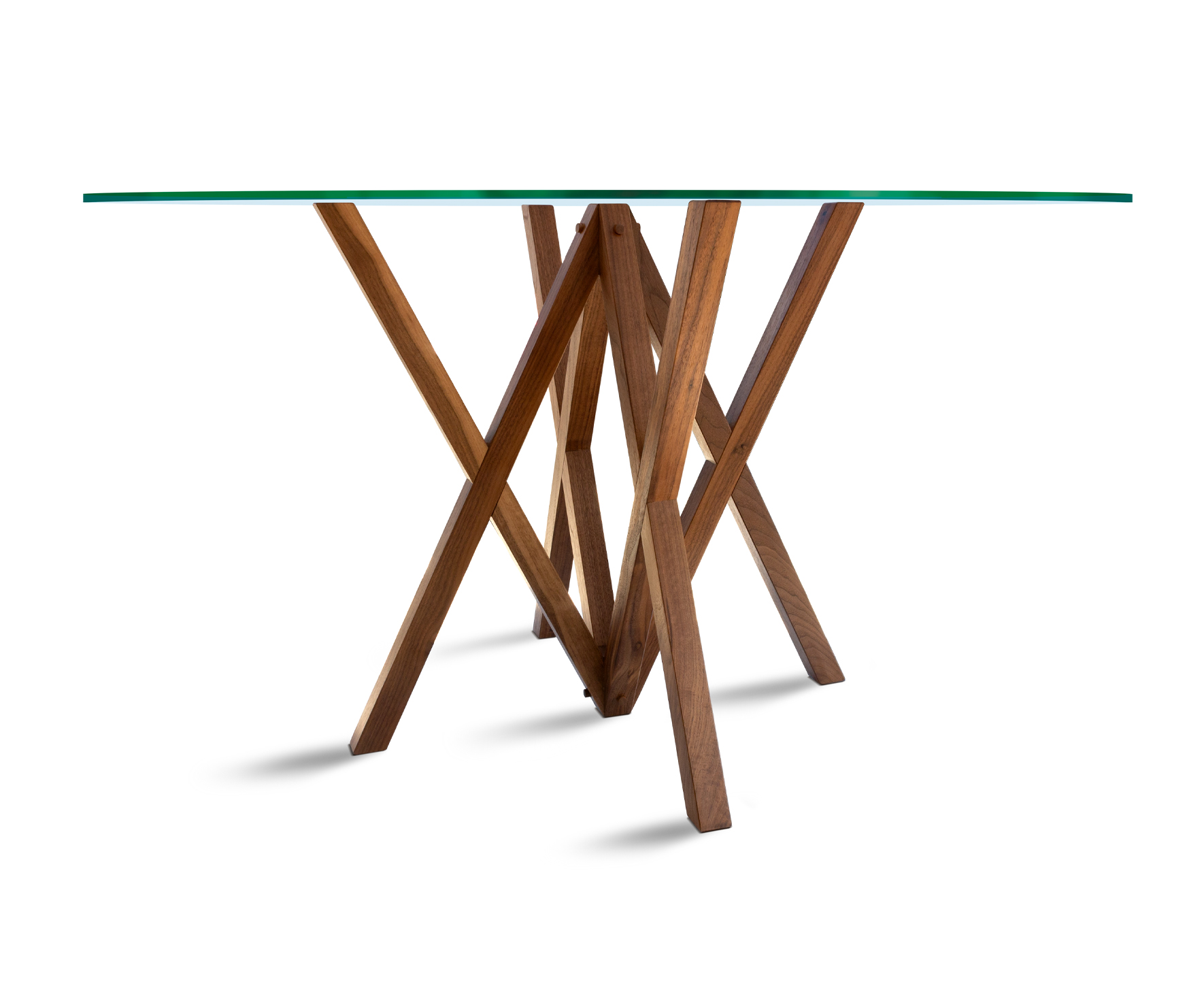 Geometric angles create a complex visual play on form and negative space. Topped with polished half inch thick glass to reveal the beautifully detailed construction and design. Shown in solid walnut.