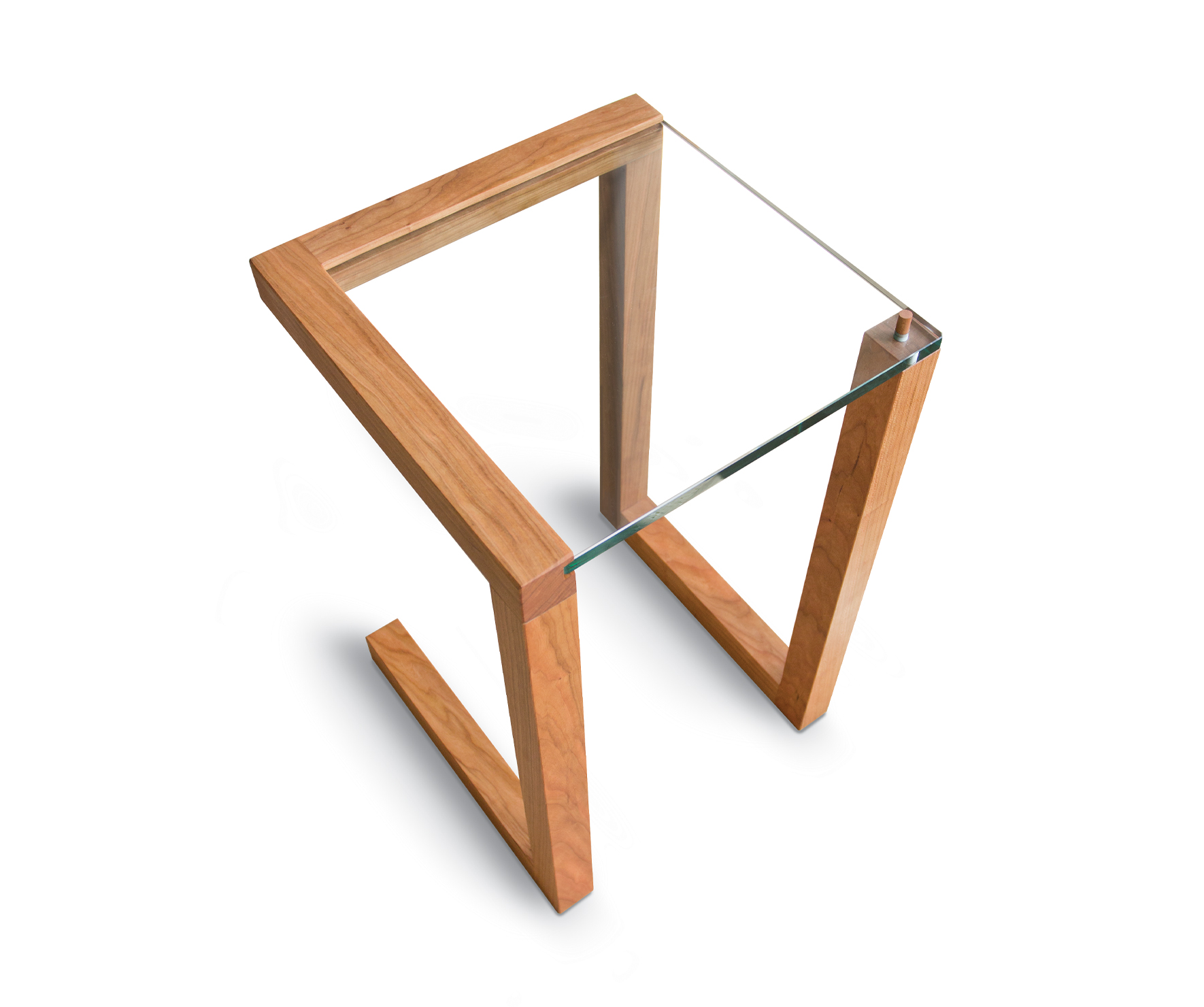 Our iconic Serpentine table utilizes a ribbon of solid hardwood that takes an unusual path to support a glass top seemingly suspended in air. A solitary dowl through the glass holds it inplace and adds unique finishing touch. Shown in solid cherry.
